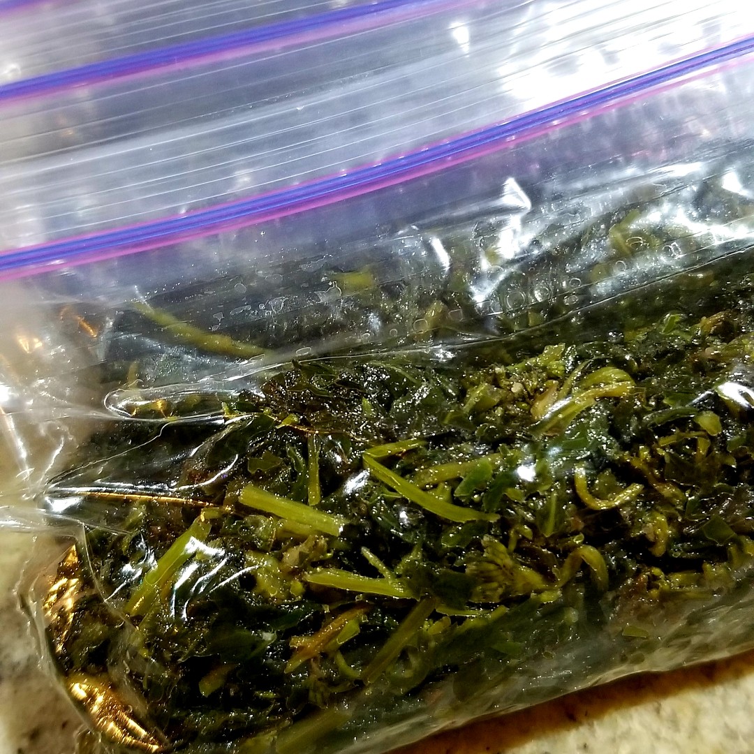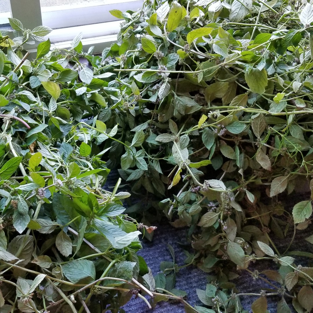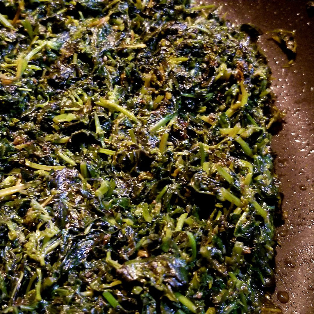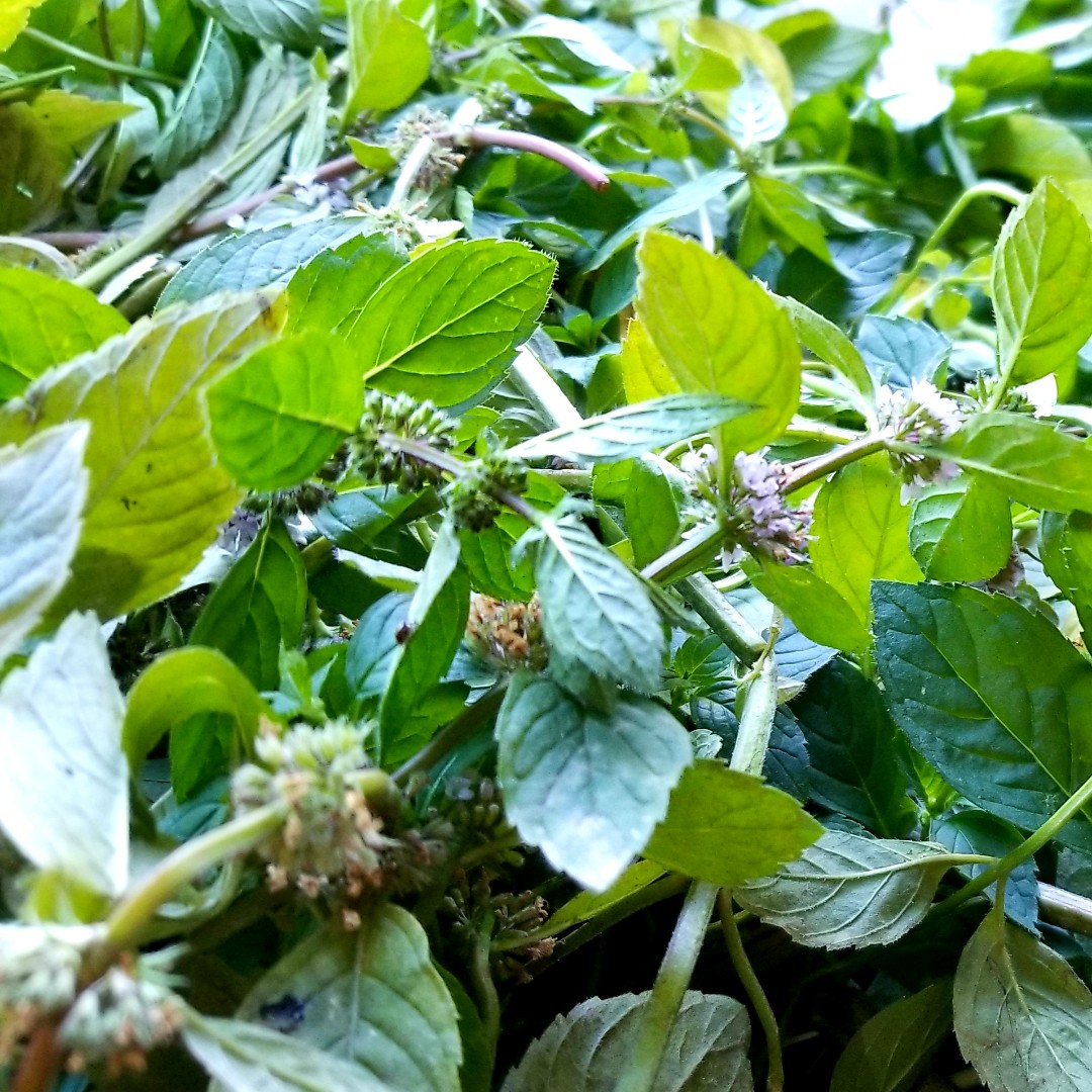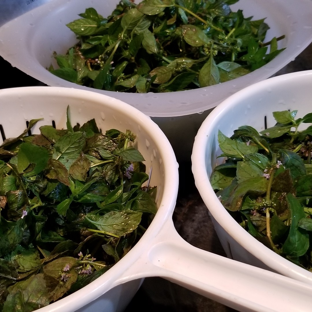 從昨日就開始悶熱異常,快被秋老虎晒乾的加拿大薄荷Mentha canadensis 要趕快採收,經過去蕪存菁,洗洗切切,然後起油鍋炒熟它們,在這中間加了鹽和白酒提香, 待湯汁收乾後就離火放涼,晚一點裝成小袋,放進冷凍庫裡就能吃很久。😊