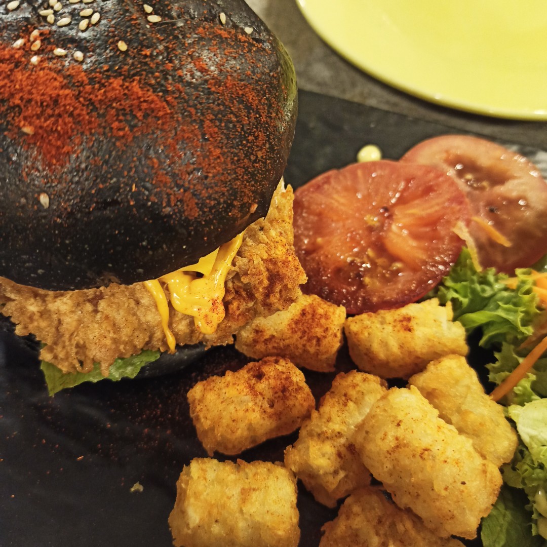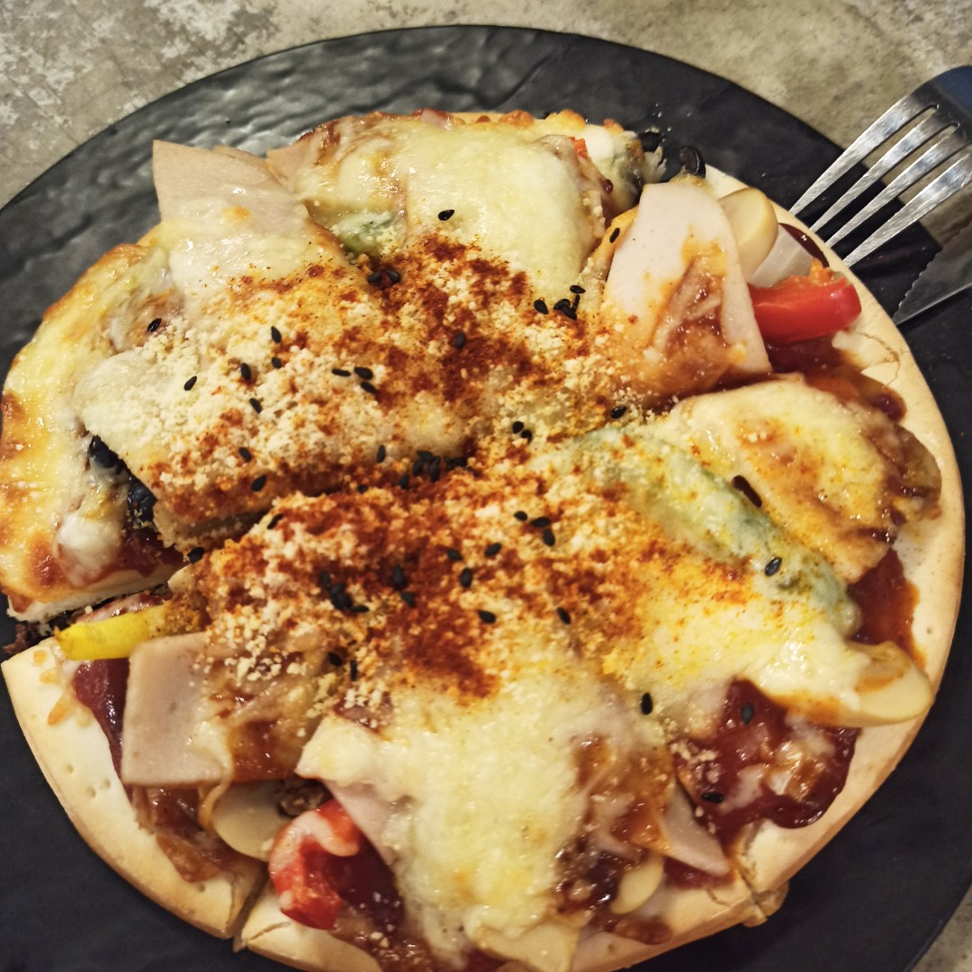 去了家西餐厅,点了一份汉堡,还有一份披萨大家分着吃。