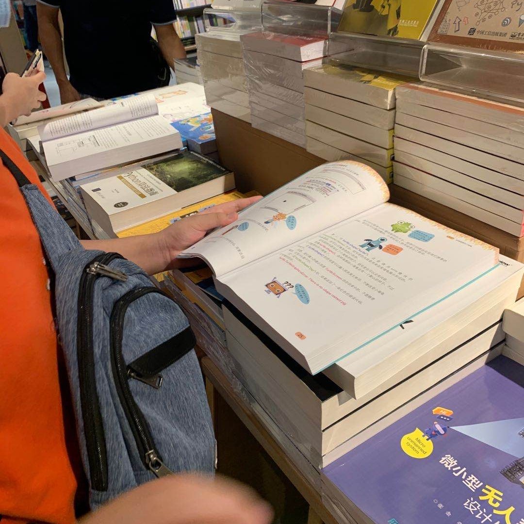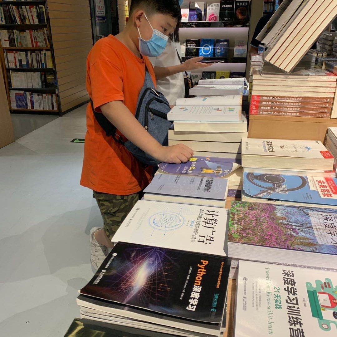 没想到来书城为了找编程相关的书籍😀。找到python这个语言的书,他看了好几本,还坐下来看了好一会。最后选好了两本,就愉快的回家了。