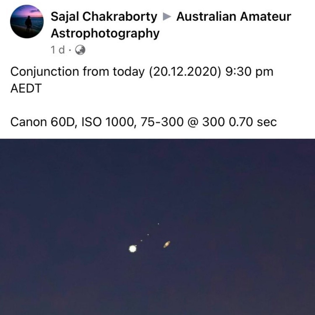 昨天晚上发了个贴感叹,现在城市里观星不易,土木相合这种难得一见的天象,只能错过。不过好在有互联网把世界各地的人们连接在了一起,天文达人们可以把自己的观星摄影作品发到网上和你我分享。今天在推特上看到了一位叫sajal 的观星达人分享的照片。这张照片拍得真是激动人心,照片中可以清楚的看到木星和土星,两者的距离非常接近,木星轨道距离太阳更近,相同曝光下显得更亮,土星标志性的光环也清晰可见。木星右上角有四个光点,它们是木星的卫星,木星的卫星已经发现的多达67个,这四个个头最大,当年伽利略最先用望远镜发现了它们,所以这四个也叫伽利略卫星。而且伽利略发现这四颗卫星是围绕木星旋转的,找到了推翻地心说的实质证据。当然这么震撼的景象要通过望远镜才能看到。如果肉眼观看的话就是图三的样子。