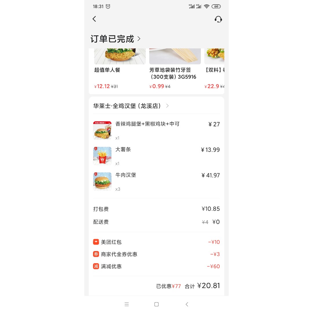 今天晚上有点懒,都不想吃饭,之前答应儿子请他吃汉堡也没兑现,所以今晚就点华莱士。上美团看了一下,点了几个满减的,原价97块多的单,最后优惠付款20多点,为了吸引顾客,美团也是拼了,不过受益的是消费者。