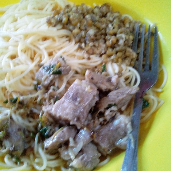 Les cuento que me levanté muy tarde, tanto así que ya era casi la hora del almuerzo, así que mi hermana @abigailaadap estaba preparándolo, ella estaba picando una chuleta en cuadritos para el almuerzo,lo hizo junto a una pasta larga, frijoles y jugo de fresa, todo estuvo muy rico.