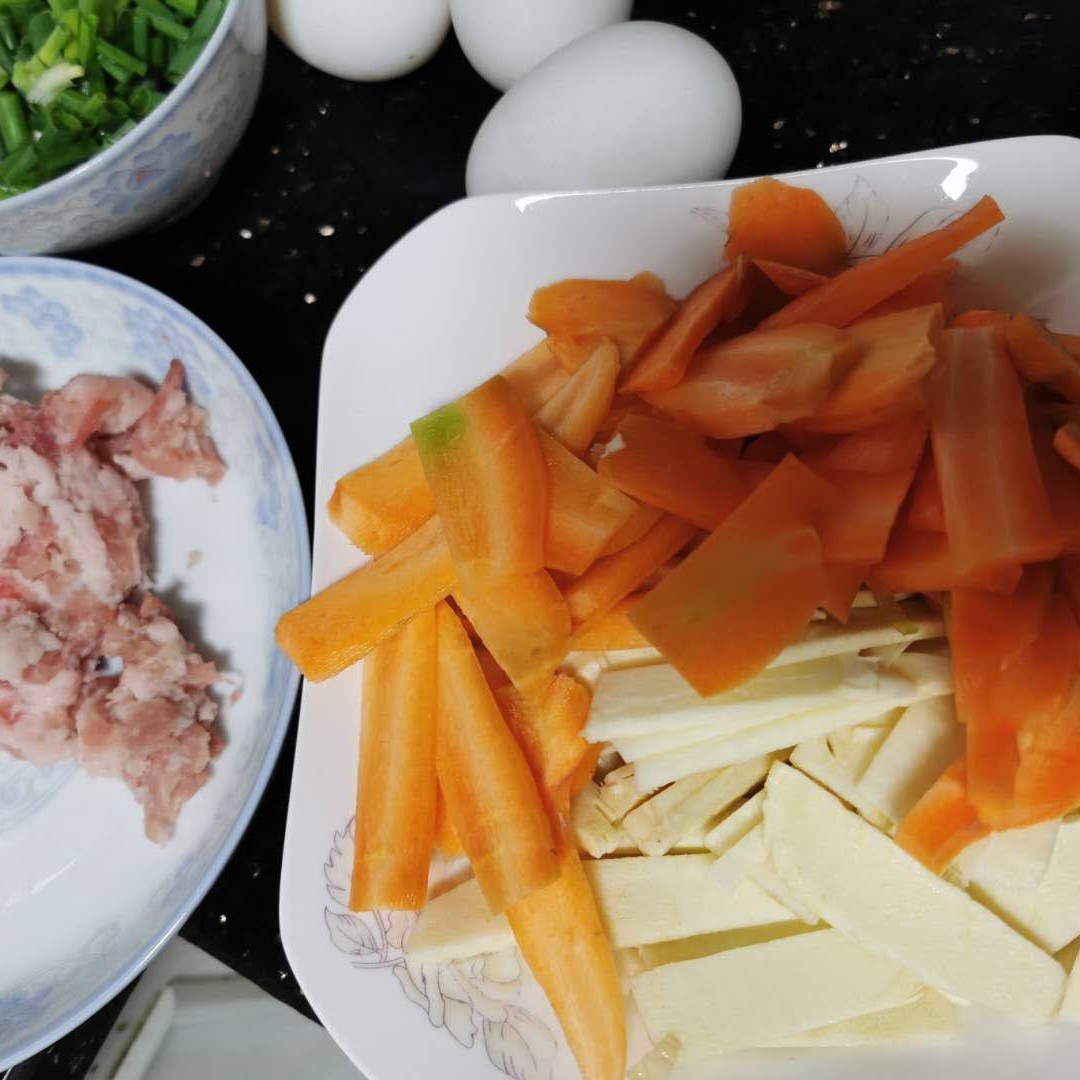 1)冬笋剥壳洗净切片,胡萝卜削皮洗净切片,肉切片。