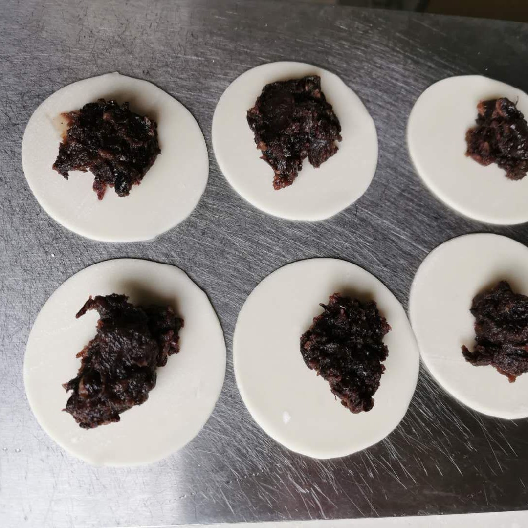3)水饺皮摊好,放入一勺豆沙,把水饺皮周围一圈涂上水,盖上另一张水饺皮,周围压实。