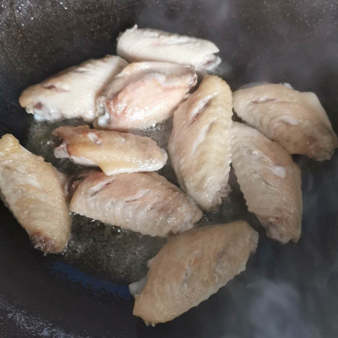 2)锅中放少许油,把鸡翅放入煸至两面金黄后倒入生抽和可乐,再加入少许清水,盖上锅盖。