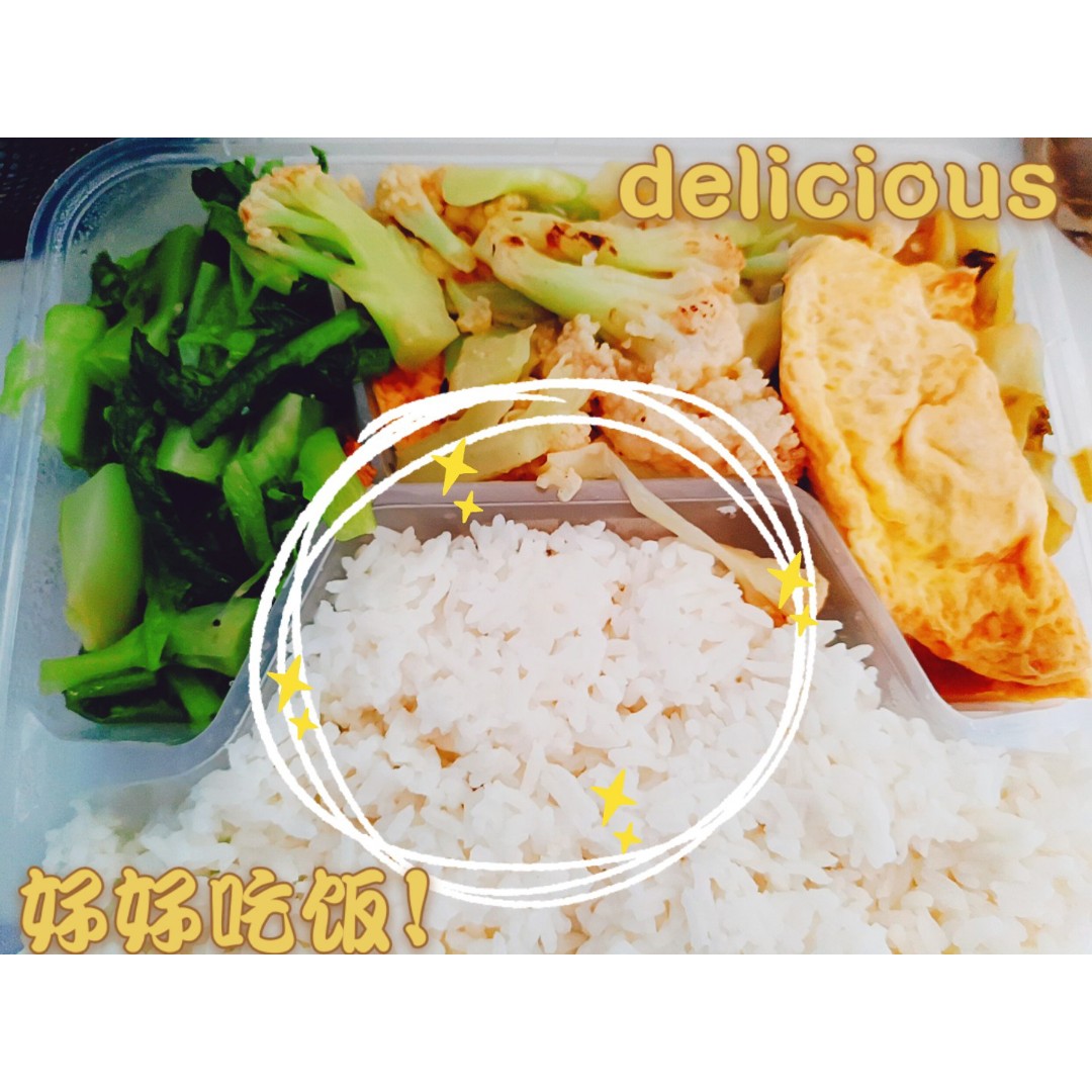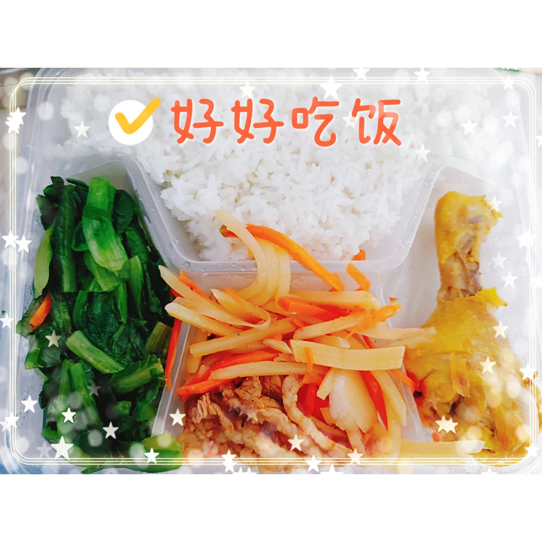 昨天的又打回原形了,又是这样包装啦,而且硬,中午预定的鸡腿🍗饭,原来是盐焗鸡还有油麦菜、土豆🥔丝红萝卜丝炒肉片、鸡腿好好吃,想再来一只!晚饭就是鸡蛋角,有三只,还有椰菜花炒肉🥩和青菜!