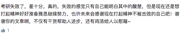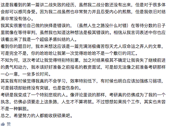 我后来把自己二战失败的经历发到知乎上,还是有激励到一些考研失败的同学的。其实我真的特别能理解每一个考研失败的人的痛苦,但是我依然觉得有梦想就要去追逐,就要去追逐自己最想要做的事情。即使失败,也会有很多其他的收获。
