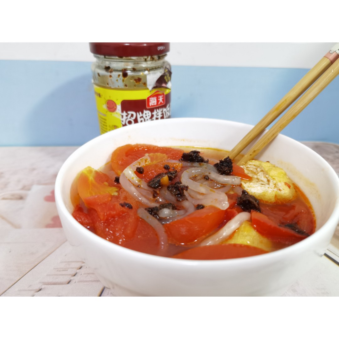 不知道吃什么,就在超市买了包土豆粉,买个番茄加几块油豆腐,水一开,东西往里一倒,放点油盐,就坐着等吃了,本想加点瑶柱一起煮的,后来却忘记了。原来土豆粉还挺好吃的,不过感觉口味有点清淡,后来又加了一勺香菇拌饭酱,香多了。嗯,真是一顿简单的晚餐。