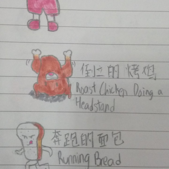 This is my drawing. The first photo was a Roast Chicken 🍗Doing A Headstand and a Running Bread. The second photo is an ice cream was archery and a Singing Ice cream. The third photo is an Cheese 🧀cube Santarina and the Noodles Choir and the fourth photo is a happy bun. Now is the last photo is a Avocado Archaeological and a Candy Corn ghost 👻. 😂😂