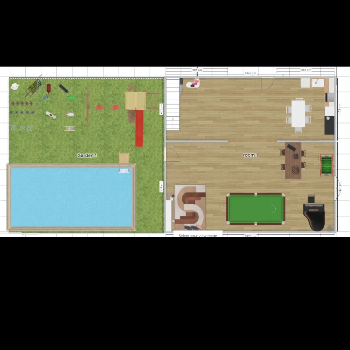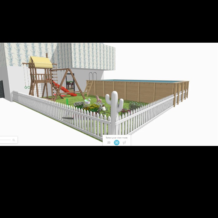 第一张照片是我的第一楼屋子的"外型"。第二张是从上往下看的照片第三则是我的小后院。后院里有一个小小的游乐场🎠、四架脚车🚲、一个花园🌸、一个会发光仙人掌🌵和一个泳池。