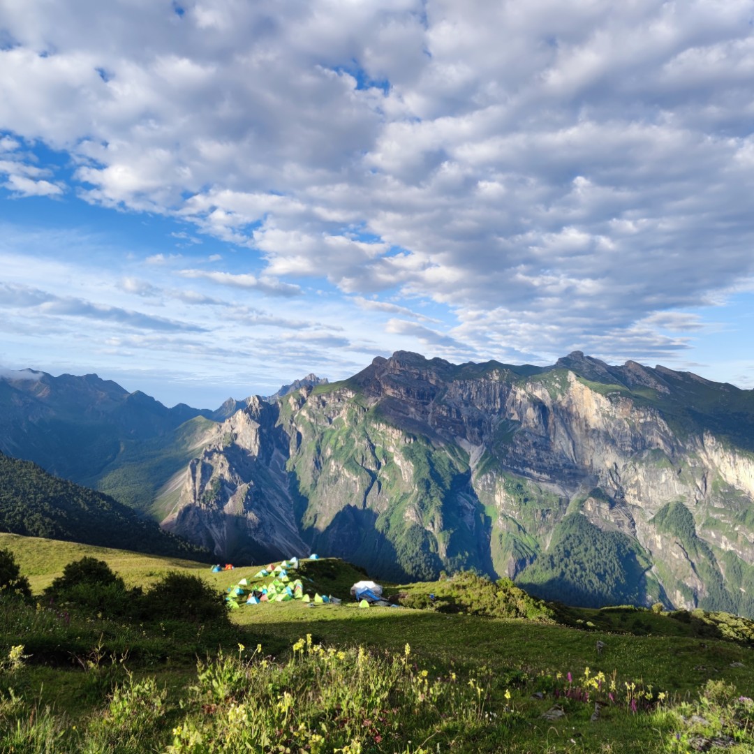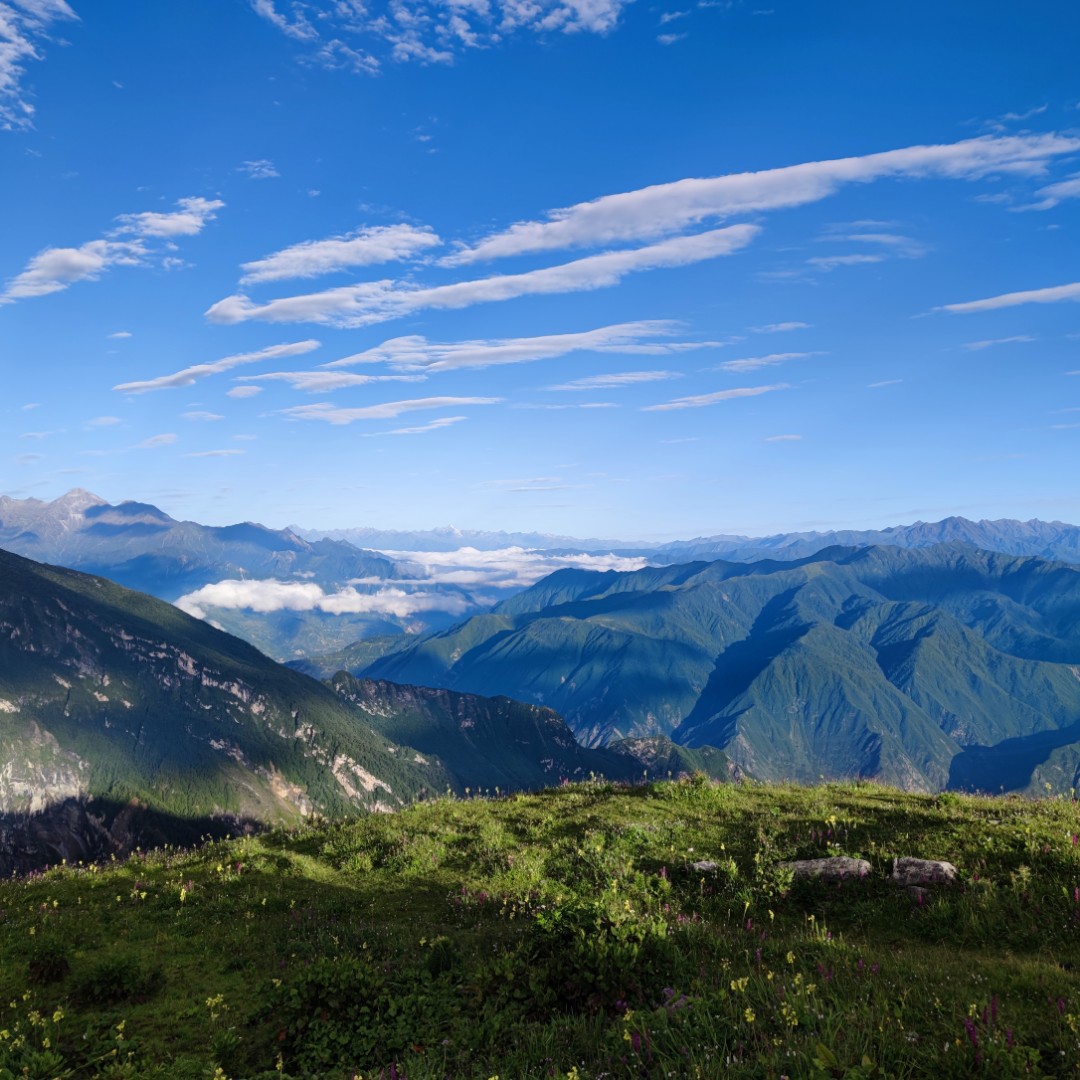 阿坝九鼎山,站在高处一览无余的感觉真好。远处看去山峰跟天空相辉映,感觉能直接触摸到云一样,蓝天白云下面有着马儿在吃草嬉戏。