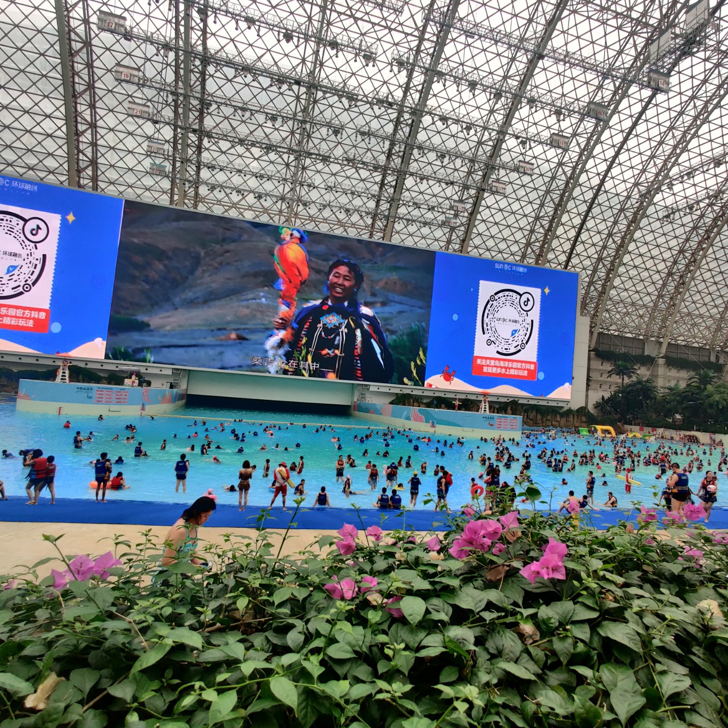 环球中心的海洋乐园,今天好多人,泳池像下饺子一样,炎热的夏天,大家在泳池里面玩的好开心。
