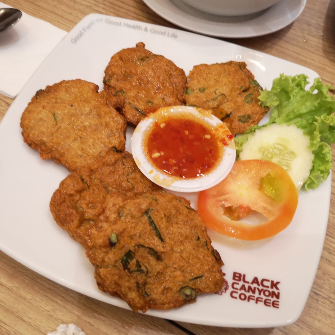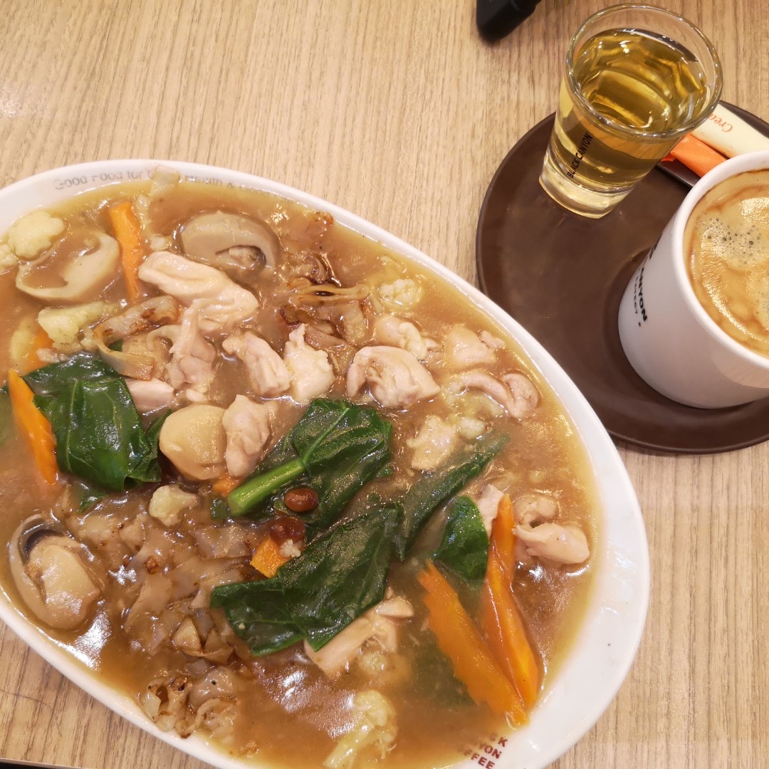 After watching Dr. Strange with family and friends, we went to a restaurant called Black Canyon. I ordered chicken kuey-teow ladna. A popular Chinese and Thai food. Basically, the flat rice noodles would be stirred fry first till slightly crispy, then topped with savoury egg broth or gravy with vegetables and chicken pieces. This was yummy, unfortunately, I couldn't finish it because I wasn't that hungry. The fish cake my husband ordered was highly recommended, very delicious, the fish cake had some herbs in it, Thai-based kind of fish cake. Dip with the Thai sweet chilli sauce, superb! Of course, I love my coffee too.