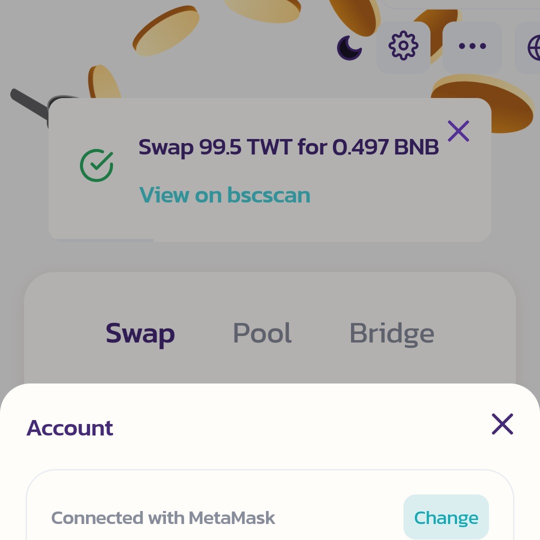 昨晚币安发了100个TWT,我以为撒玩意儿。还没有价值。半小时后灵光一闪。快去币安智能链。果然在币安智能链的DEFI里面有交易对。索性直接换了BNB,折算下来100块钱。