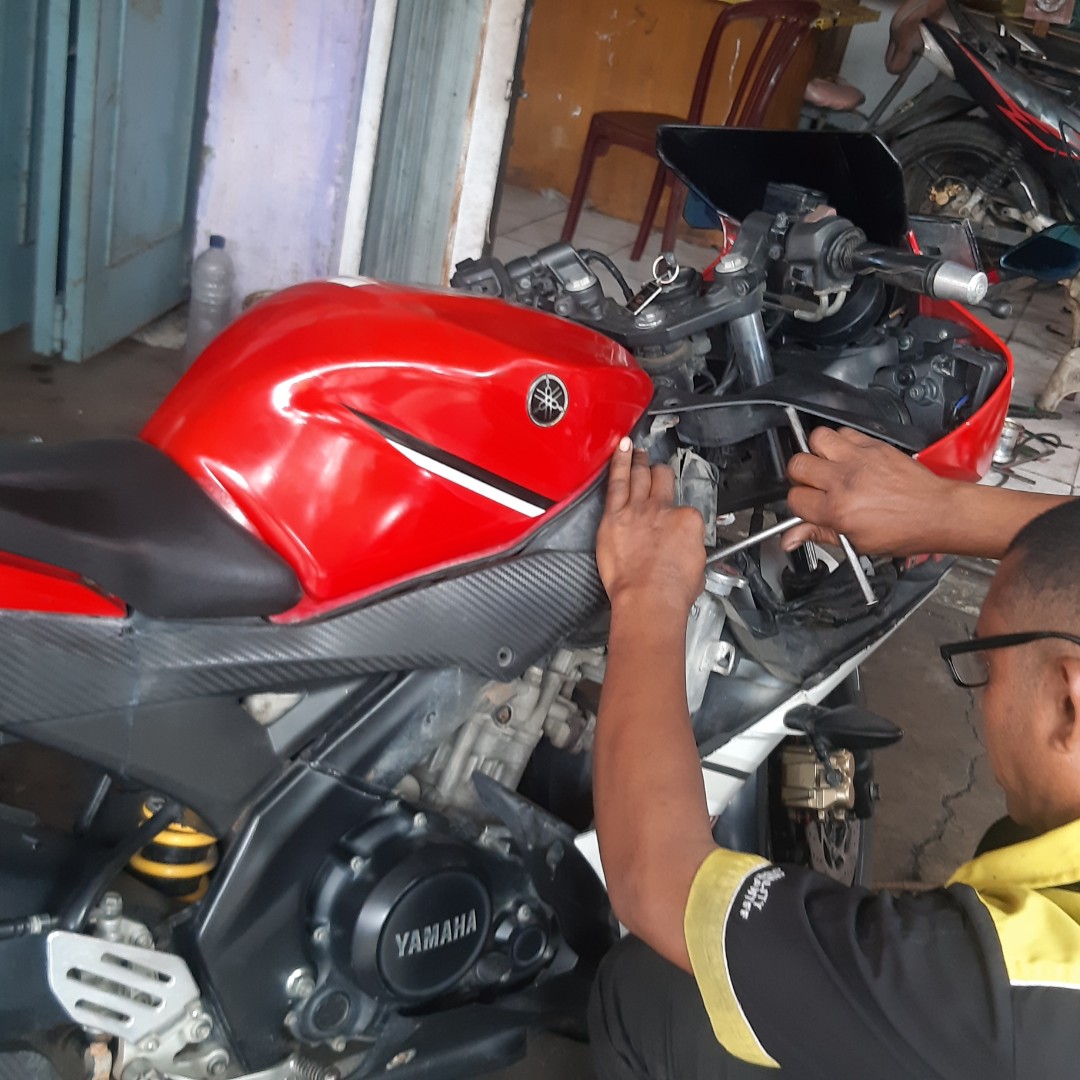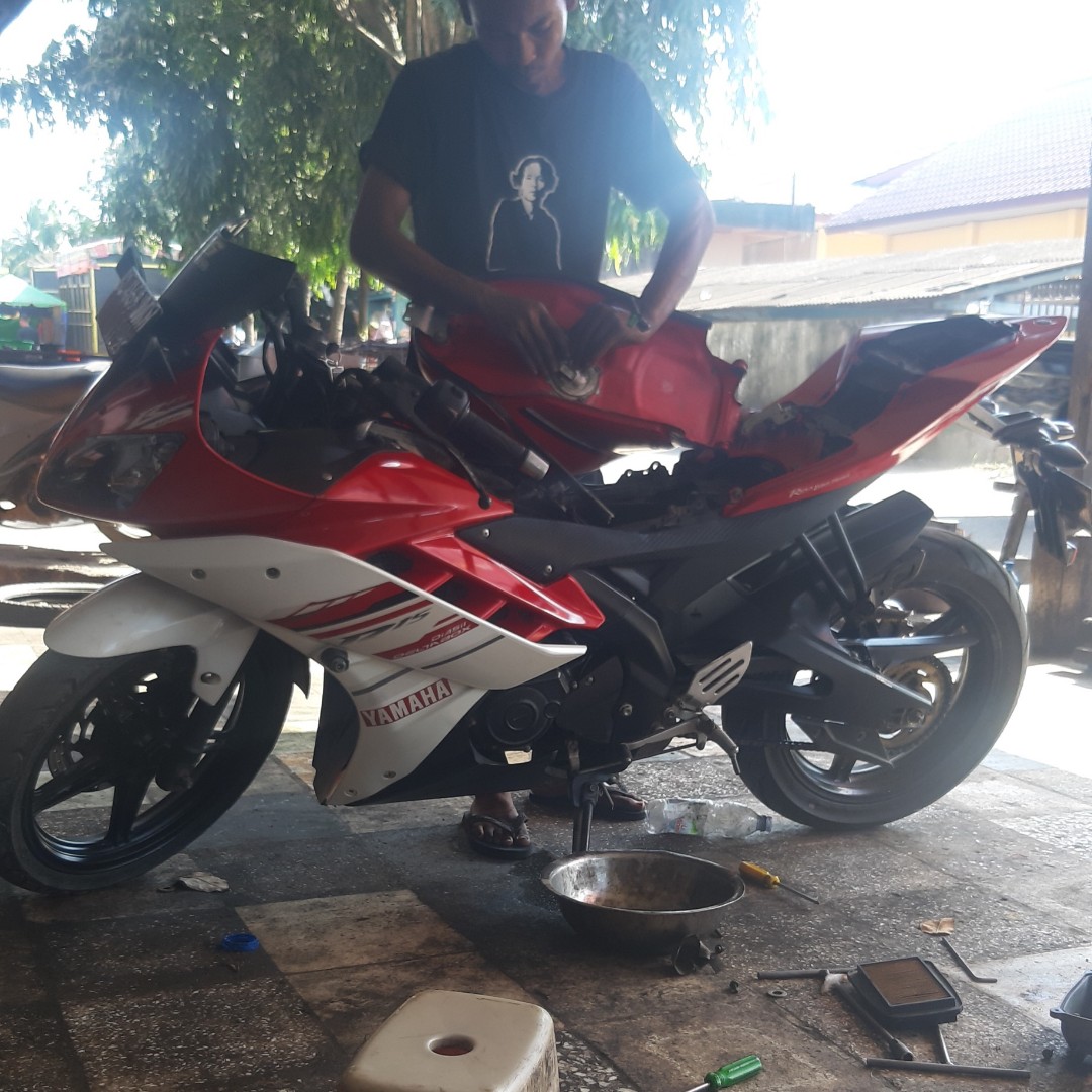 seperti yang kalian lihat saya menggunakan kereta Yamaha R15 dan kereta ini lumayan cukup berat dan sangat susah untuk didorong jadi meskipun begitu saya tetap terpaksa untuk melakukannya jika tidak mendorong apalah boleh dibuat hanya itu satu-satunya jalan yang bisa saya lakukan tadi hari.