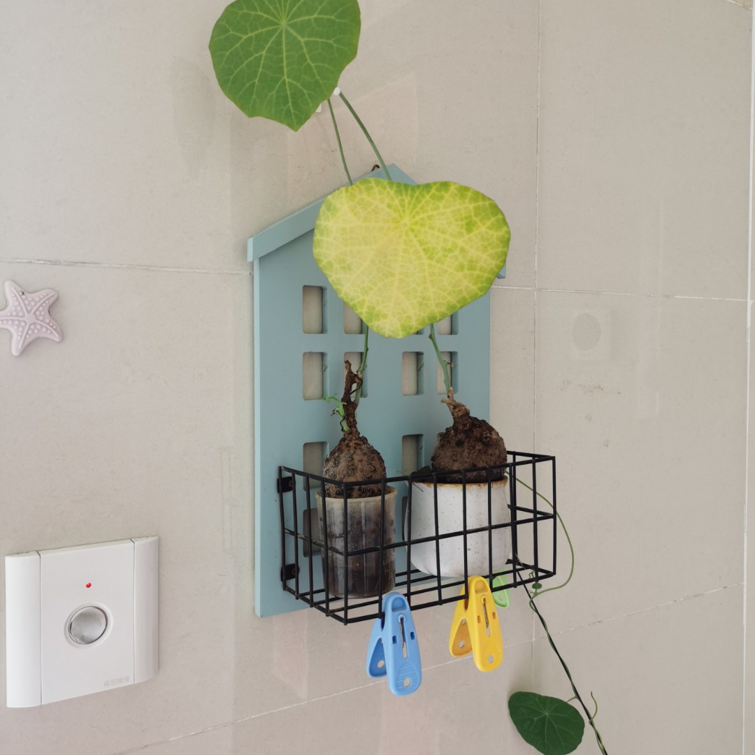 我家门口的墙壁上,挂上一间“小房子”,疫情期间,给孩子买的乒乓球训练杆也被用上,摆上爬藤植物,虽没有爬满墙,可是绿色的藤蔓点缀一下,门前也是美美的感受,连上门抄煤气度数的阿姨,都夸赞我的门前漂亮😀