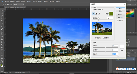 第四步,把透明度调整到100%,单击“确定”(如果找不到替换颜色,也可以用色相/饱和度代替,快捷键ctrl+u)。如图所示: