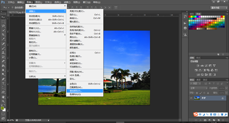 第三步,选中地面之后不要取消选择,在选中地面的情况下单击菜单栏中“图像——调整——替换颜色”。 如图所示:
