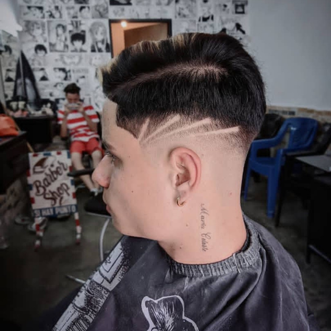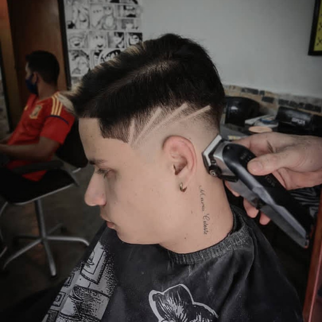 El corte realizado fue con un degradado de hojilla al peine número 2 y lo demás fue con tijera más las rayas.