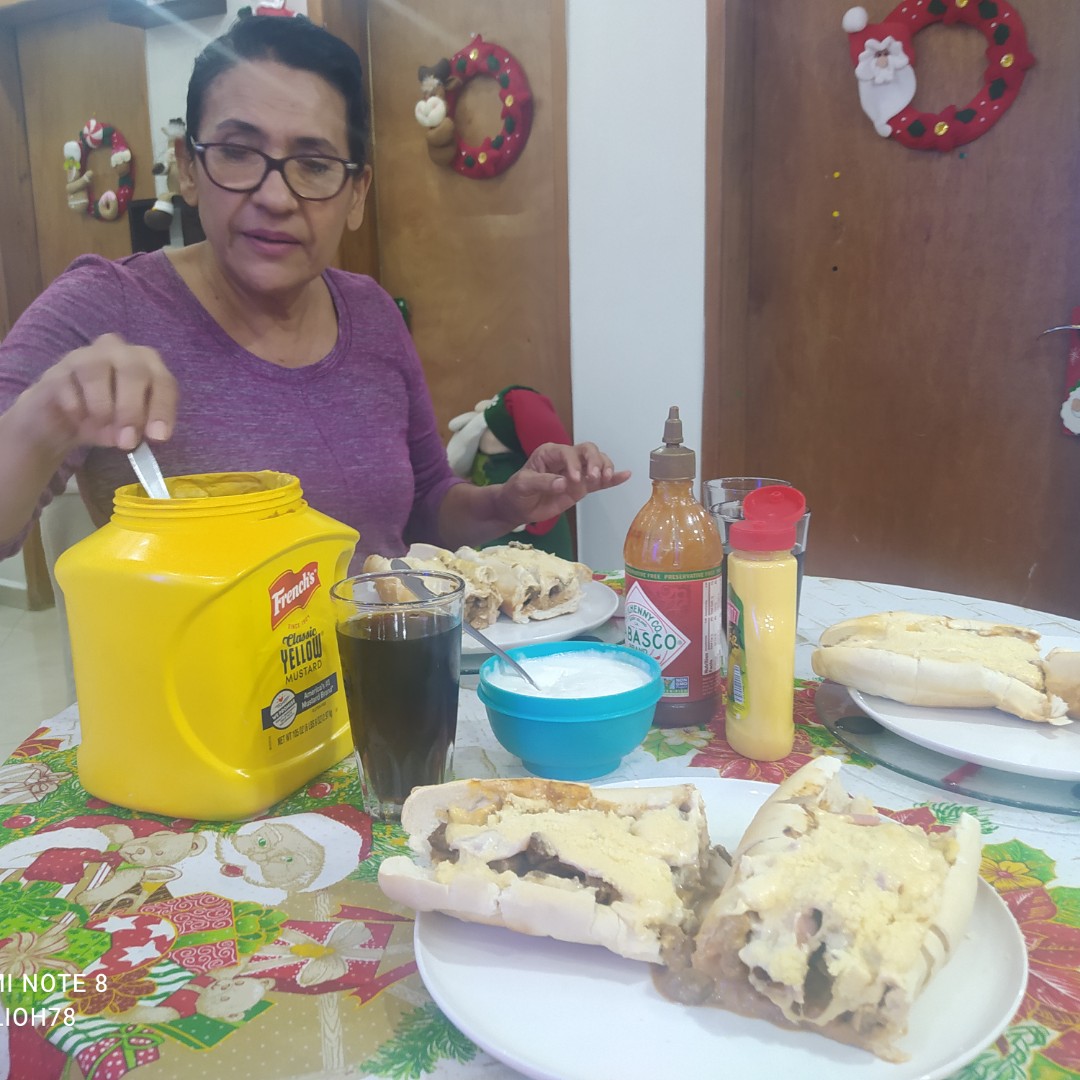 estábamos comiendo pan rellenos con carne de lomito en salsa negra, gratinados con queso amarillo y queso blanco.