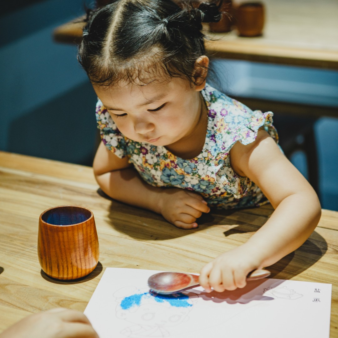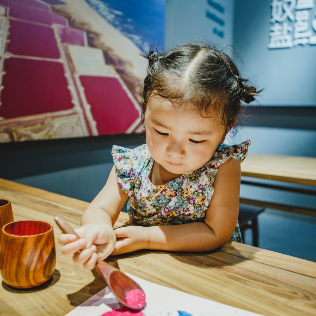 盐画体验处,是自选一副喜欢的图案,利用提供的白乳胶和各色盐粒在图案上作画。作画时只需要在想上色的地方用白乳胶打底,然后再在白乳胶上撒上喜欢色彩的盐粒,等待干燥即可。这个体验并没有什么危险,所以六宝也参与了进来,一会儿要求撒盐,一会儿要求涂胶,兴致超高。