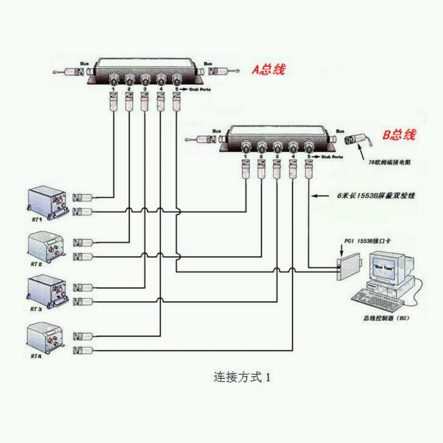 总线采用多冗余度总线型拓扑结构。支持双向传输,半双工,电平电压为18~27V(采用耦合器的情况下),传输速率为1Mbps,编码采用曼彻斯特II编码(0→1为0,1→0为1)。整个总线采用了很多射频组件,比如耦合器(ESI-40),连接器(PL75-47)以及端接组件(TNG1-4-78),同时采用了隔离变压器。采用隔离变压器有如下好处: