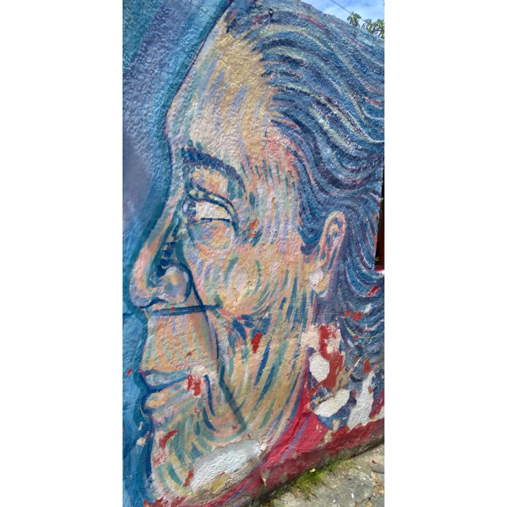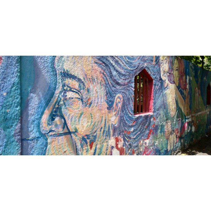 A pesar de estar en una superficie que se va deteriorando, aun se puede apreciar el arte urbano en esta fachada.