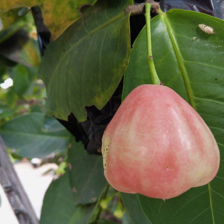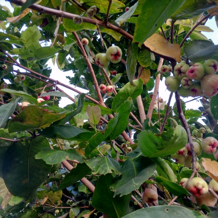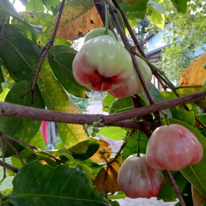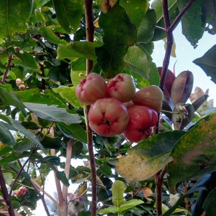 Segar-segar sekali buah jambunya, kulitnya mulus, bentuknya besar, dan merah buahnya. Siapa yang tak akan tergoda melihatnya. Tapi saya tidak tau ini jambu apa, yang pasti rasanya manis, dan enak kalau dibikin rujak. Kali ini buah jambu punya kami berbuah cukup banyak, buahnya ada yang bisa dipetik langsung dengan tangan karena rendah. Sementara untuk buah yang tinggi, harus dipetik pakek alat bantu, atau kita panjat terus pohonnya. Buah yang sudah tampak merah keseluruhan, harus segera dipetik, karena sudah matang full. Kalau terus dibiarkan diatas pohon, akan dimakan kelelawar, tupai, atau musang.