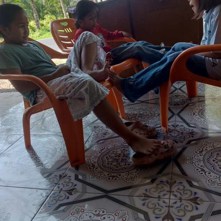 Jarang sekali saya melihat anak-anak seperti mereka duduk bersama tanpa memegang hp dan lupa segalanya. Coba perhatikan, anak-anak ini begitu bahagia ceria menikmati waktu kebersamaan. Ketiganya tampak sedang duduk bersama dalam suasana hangat, damai penuh keakraban. Sesekali mereka bercanda ria, dan tertawa gembira. Saya yang ada disamping anak-anak ini merasa senang melihat kebersamaan yang mereka tunjukkan. Momen seperti itu mengingatkan saya pada masa kecil dulu, selalu habiskan waktu bermain bersama di dunia nyata, tak ada hp, tak ada game online yang sangat meresahkan.