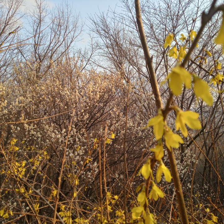 Flowers in bloom. The first to show are the golden bells. After that all the flowers break loose. There are in a small neighborhood near a temple.