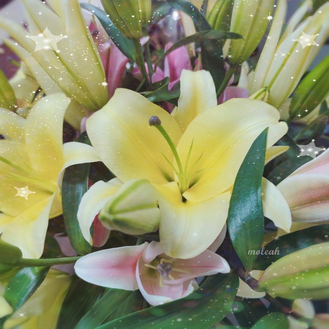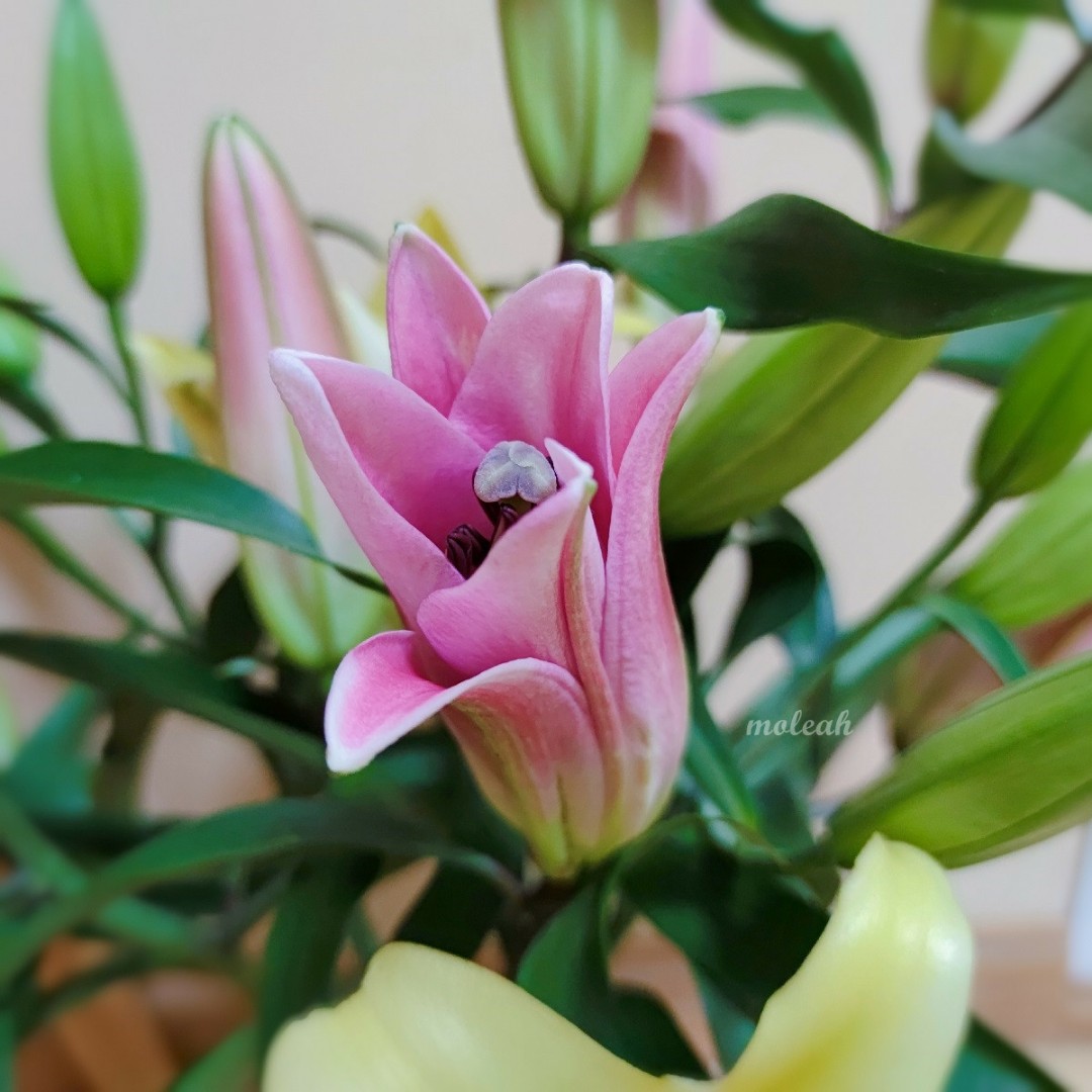 粉色的刚绽放一点点,黄色的倒是已经完全绽放了。百合开放后可以把花蕊摘掉,这样可以延长花期,开放的花朵能保持更久一点!