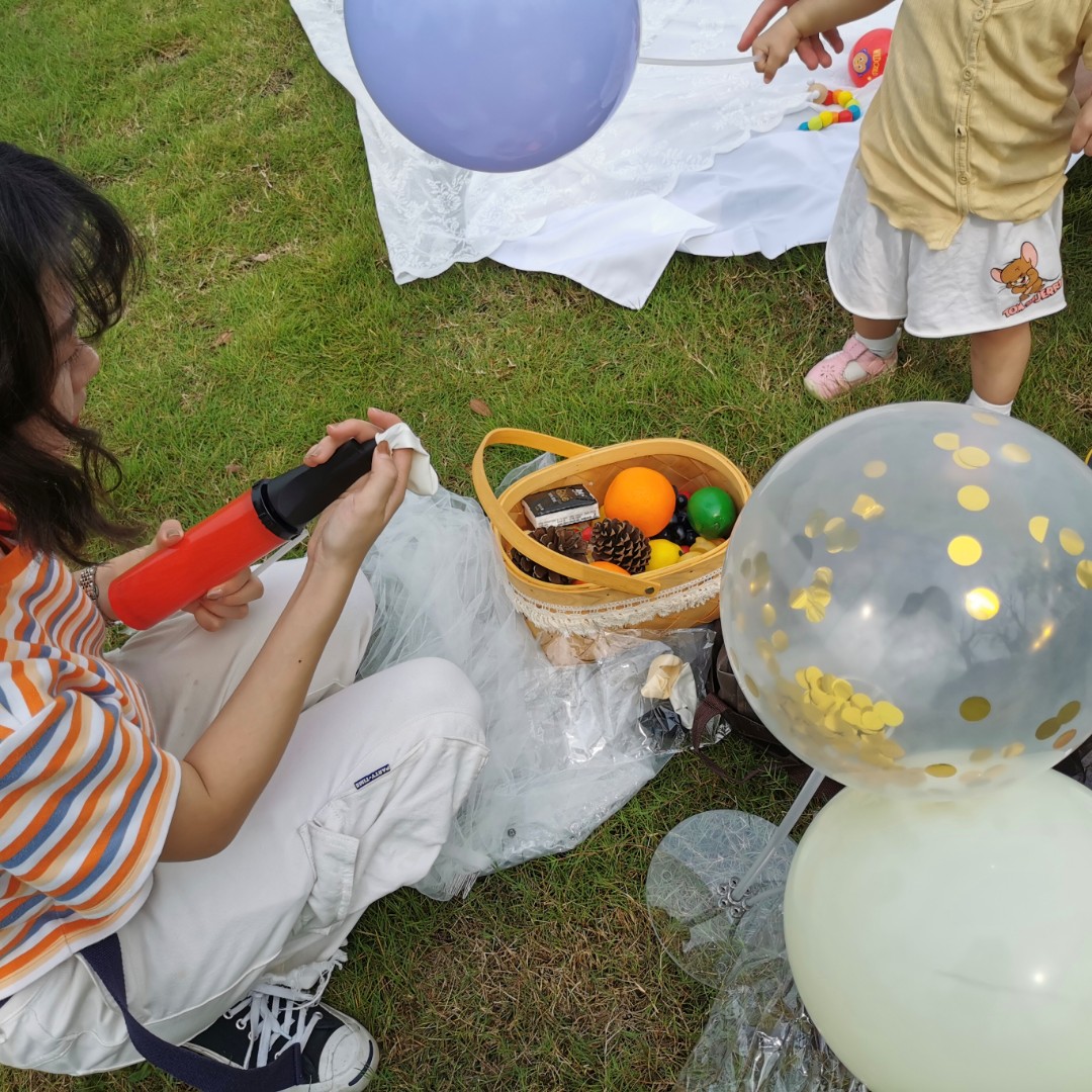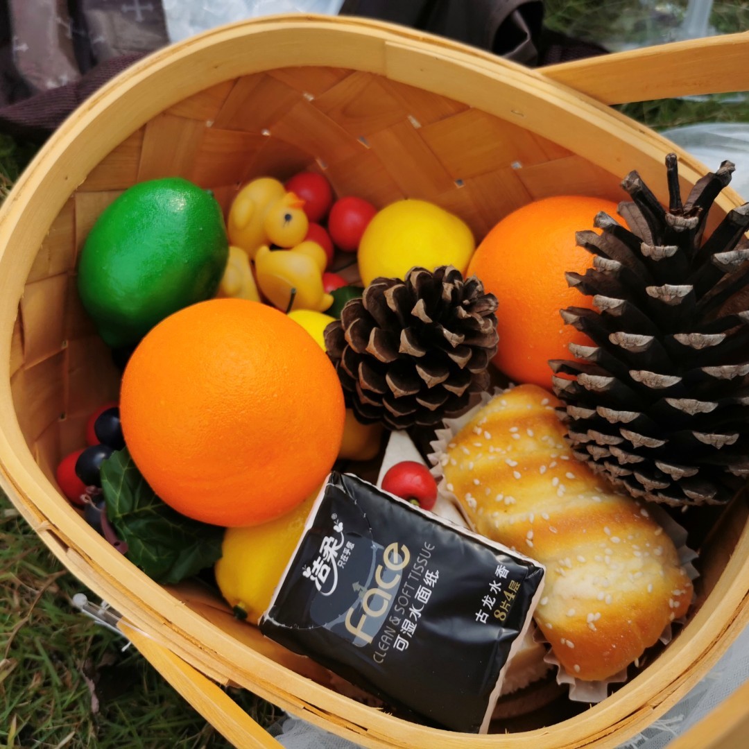 一个纯白色的小帐篷,搭配着白色餐布,以及篮子里面的仿真水果,面包点心和小玩具等等,还有浅色的网红气球等等。