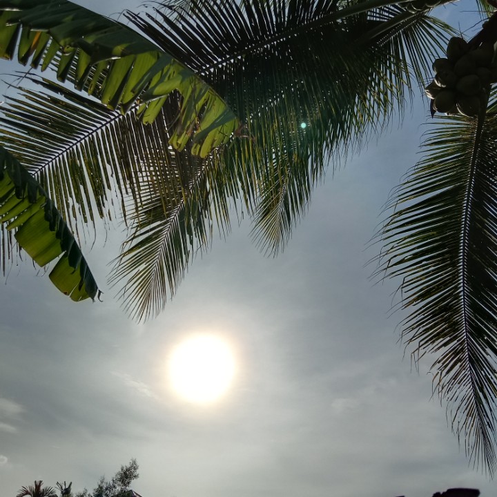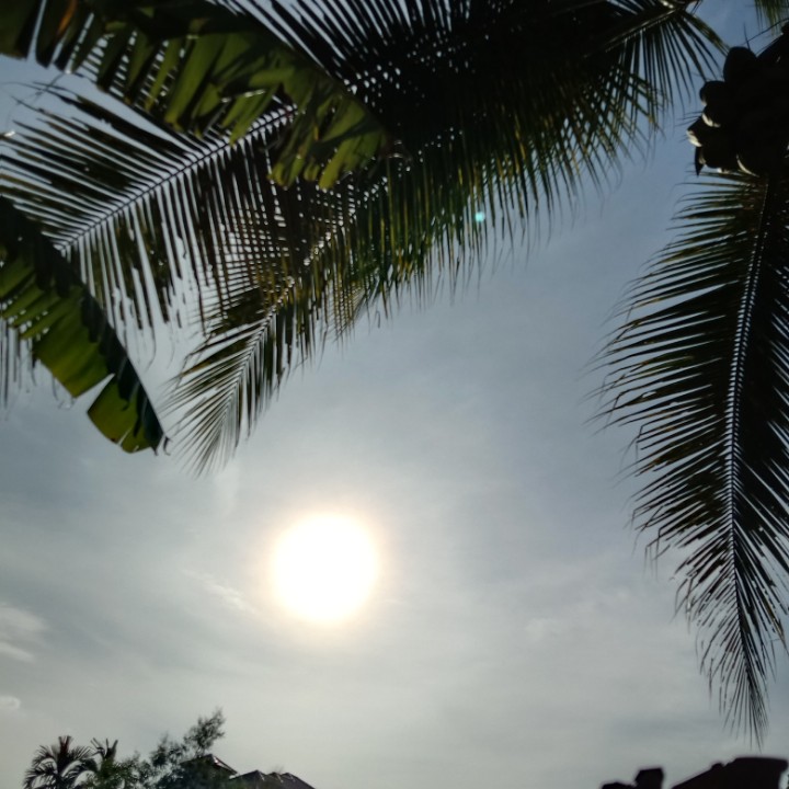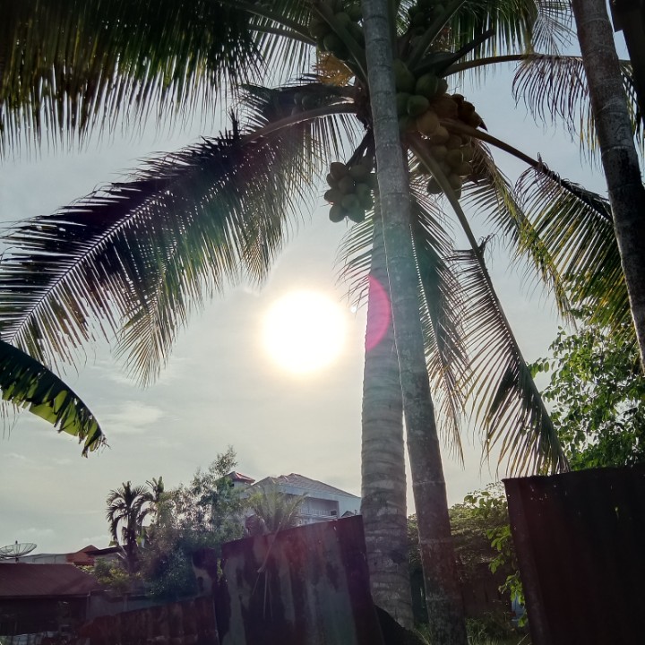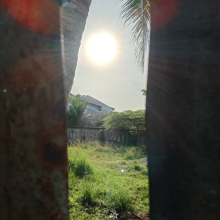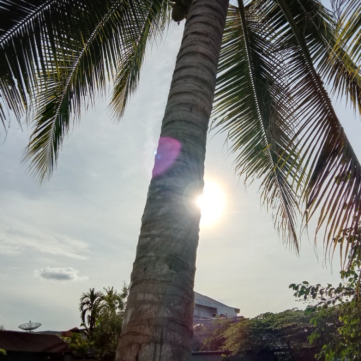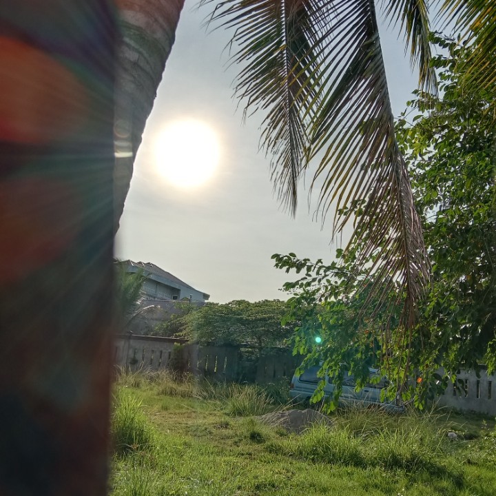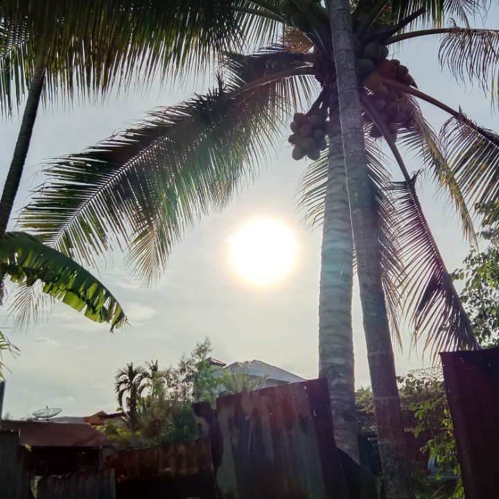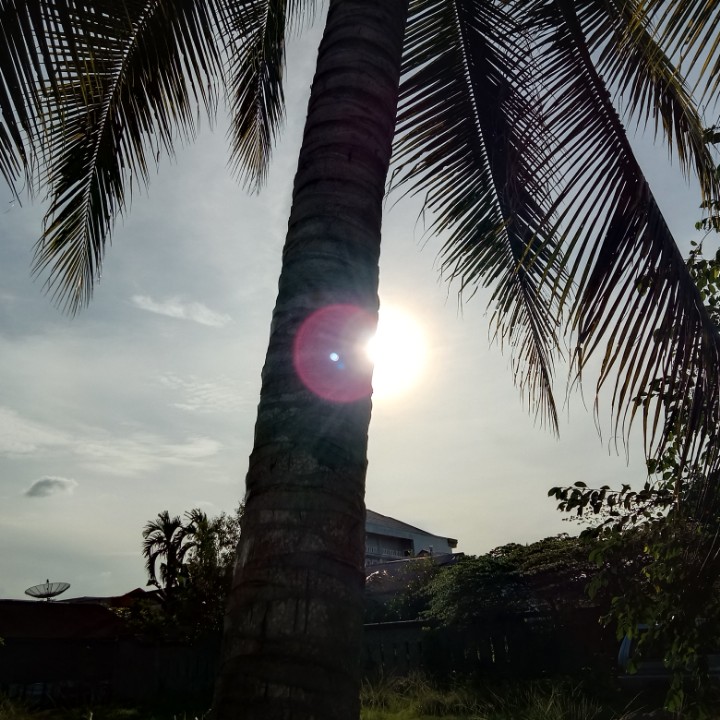 tadi saya mengintip dari pagar yang terbuat dari seng bekas memfoto matahari dan dari samping belakang pohon kelapa saya memfoto keindahan matahari yang tidak bisa katakan apa bagusnya.
