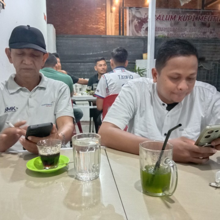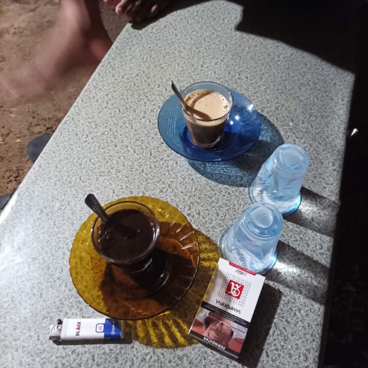 ketika malam itu saya pergi duduk di warung kopi bersama teman-teman dan di sana kami bercanda tawa dan sambil minum kopi atau minuman-minuman lain.