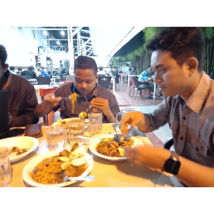 pada malam itu kami dan teman-teman duduk makan mie bersama di sebuah warung dan kami makan mie menggunakan kerang di dalam mie yang kami makan bersama-sama.