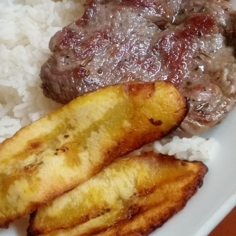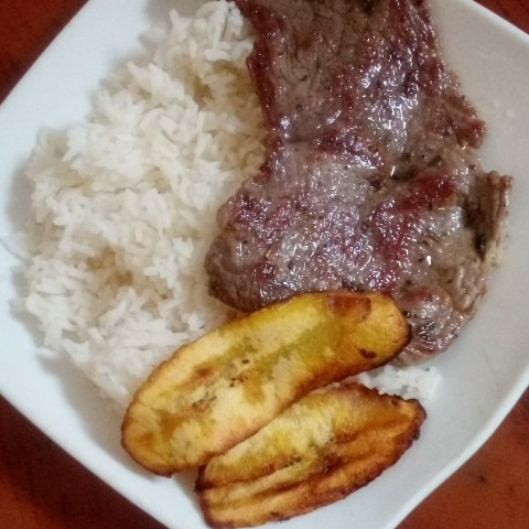 Preparé un rico arroz blanco para luego hacer un bistec a la plancha donde, le coloque ajo, adobo, cebolla rallada, pimentón rallado, sal al gusto, luego frite plátano, serví el almuerzo.