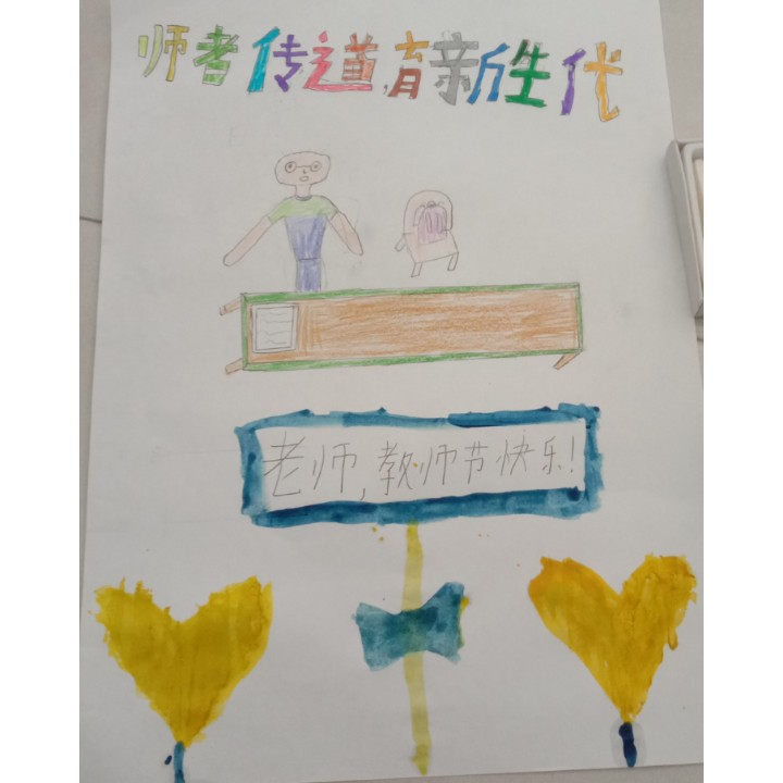今天在网上庆祝教师节。今天有比赛的画画。站着的是班主任(周老师),旁边的是老师的书包。在老师前面的是他的桌子。老师的上面是题目。下面的是我自己加上去的。你觉的好看吗?在下面留言让我知道。
