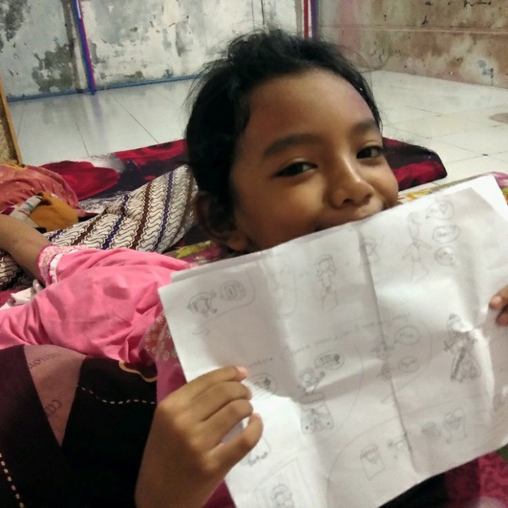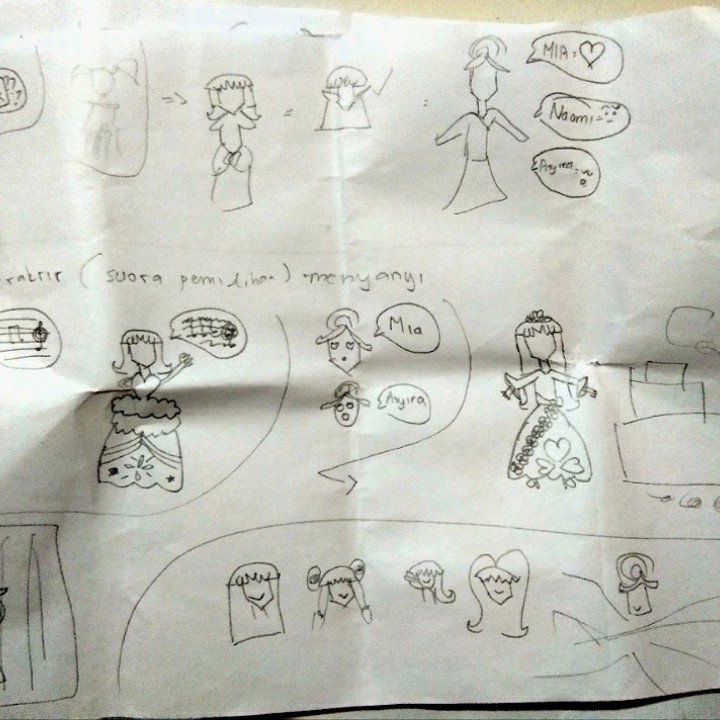 Ternyata gambar-gambar itu memiliki kisah, ia bercerita bahwa gambar orang lukisannya terdiri dari : MIA, LAGITA, NAOMI, ASYIRA dan SENA. ia mencerikan lengkap kisah dalam gambar itu. tapi aku tidak tahu sibungsu terinspirasi dari mana.