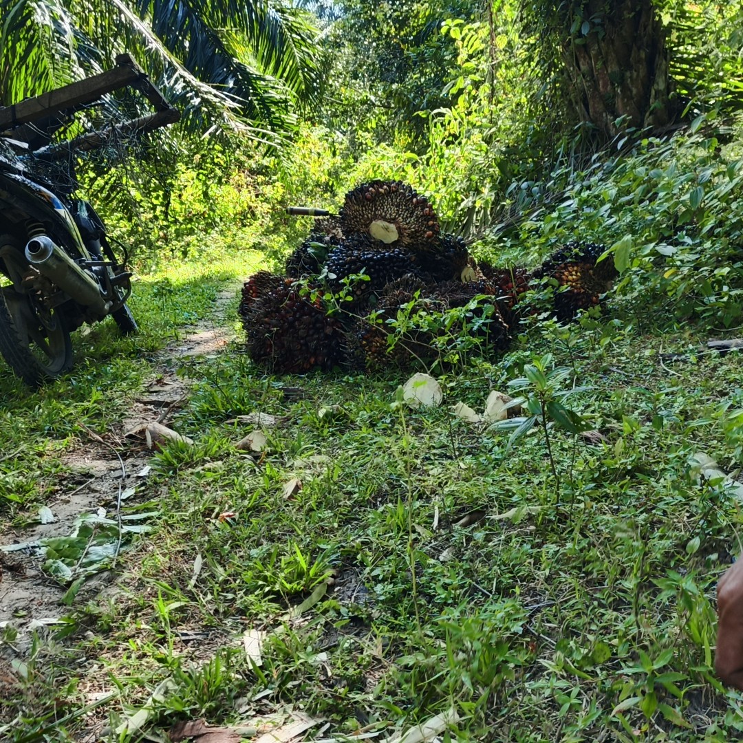tumpukan sawit di kebun orang yang saya mau angkut ke pangkalan sawit untuk di jual mau belik takjil buat berbuka puasa nantik karena sebentar lagi udah mau asar.ini cukup lah buat belik takjil buat berbuka puasa nantik yang jangan pantang menyerah usaha apa yang mungkin