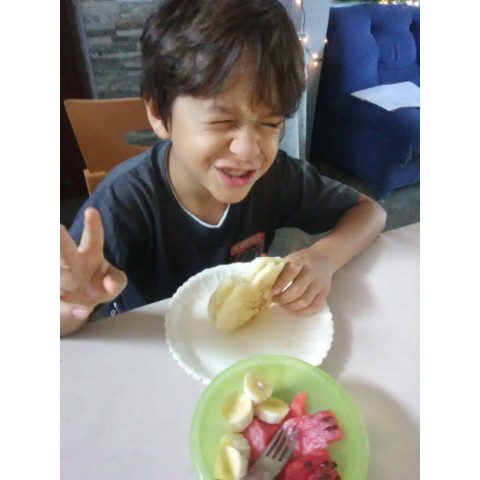 Lavé mis dientes y rostro, tomé mi café matutino ☕ y me dispuse a preparar las arepas, para hacer mis diligencias temprano. Cuando estuvo listo el desayuno, arepas asadas con mantequilla y queso y para mí hijo le acompañé el desayuno con una taza de frutas (imagen 1: mi hijo Santiago desayunando arepa asada con queso y una taza de patilla🍉 y cambur 🍌 picados).