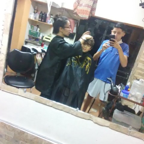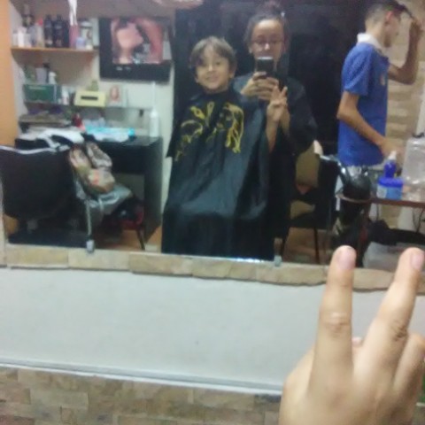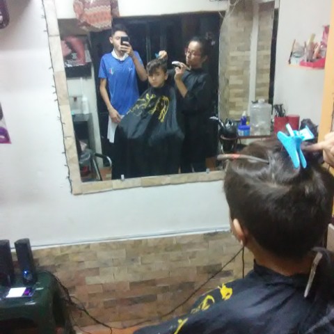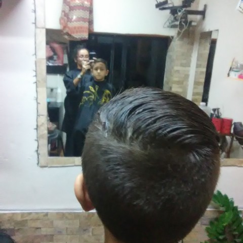 A las 7pm guardamos todo y me fui a la peluquería a afeitar a mi esposo y luego a mi hijo Santiago (imagen 4: Santiago antes del corte) luego comencé a seccionar el cabello con pinzas y verificando que estuviera parejo antes de comenzar ( imagen 5: @sakurarte preparando el cabello de su hijo Santiago con pinzas antes de comenzar, acompañados de @elieva mi cuñado, quien toma la foto con mi teléfono), continuamente le pasé la máquina de afeitar, como estaba muy peludo comencé con la N°5, luego la N°3 y para retocar la N°2 ( imagen N° 6: @sakurarte afeitando a mi hijo Santiago con la máquina, igualmente acompañados por @elieva mi cuñado, quien toma la foto con mi teléfono). Luego continúe la parte de arriba, mojando su cabello y seccionando por parte, para cortar con la tijera, así lo hice con toda la parte de arriba y finalmente culminé el corte de cabello ( imagen 7: @sakurarte junto a mi hijo Santiago terminado el corte).