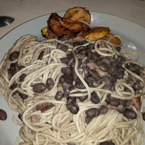 Cuando estuvo listo el almuerzo, mi esposo nos llamó a la mesa a almorzar espagueti con caraotas, chuleta ahumada troceada y tajadas, acompañado de un vaso de Coca-cola. ( imagen 2: almuerzo del día).