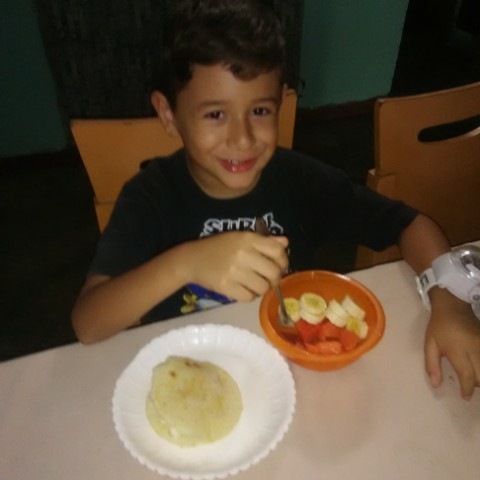 Preparé el desayuno, arepas asadas con jamón y queso mozzarella, jugo de Lechoza y para Santiago una taza de frutas picada adicional. ( imagen 3 : mi hijo Santiago desayunando taza de frutas picada: Lechoza y cambur, arepa con jamón y queso mozzarella).