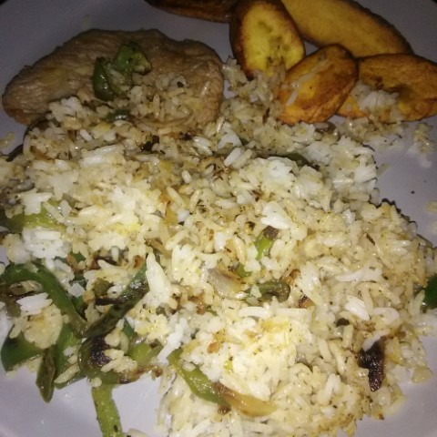 A la 1pm comencé a preparar el almuerzo, piqué las cebollas, ají dulce, ajo para el arroz,( imagen 5: @sakurarte picando cebolla y ají para el arroz) lo coloqué en el sartén, lo sofreí y le agregué taza y media de arroz, lo removí un poco y luego le agregué 3 tazas de agua y un poco de sal. Para la proteína preparé Bisteck con pimentón y cebollas en juliana y por último tajadas. ( imagen 6: almuerzo emplatado arroz con cebolla, pimentón, Bisteck y tajadas).
