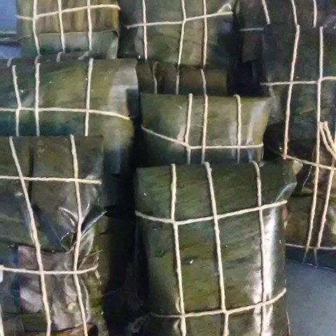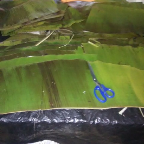 Yo me encargué de armar las hallacas, (imagen 5: hallacas estirada y armada antes de doblarla) comencé estirando la masa, luego agregué el guiso, continuamente los vegetales, las pasas y aceitunas, por último doblo la hoja para darle forma, mi esposo se encarga de amarrarla y llevarlas a cocinar. ( imagen 6: hallacas armadas antes de llevarlas al fuego).