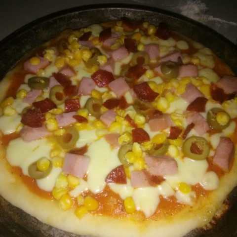 Para finalizar mi esposo me preparo una deliciosa y rica pizza de jamón con peperoni y aceitunas ( imagen 9 pizza especial,con salsa, queso, maíz, peperoni, jamón y aceitunas).