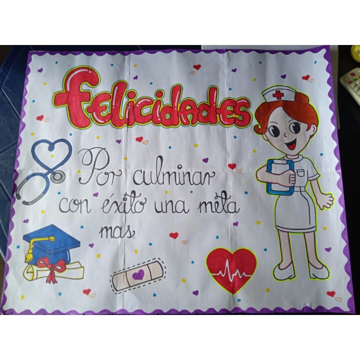 Primero busque en la computadora algunas imágenes de enfermería y de graduación para tener una idea en como realizar la lámina, ella quería algo sencillo debido al corto tiempo ya que era de un día para otro. Comencé realizando las letras de felicidades, el boceto de la enfermera y los otros dibujos de la lámina, después comencé a pintar, remarcar y hacerle algunos detalles para que se viera mejor, hasta que logre terminarla por completo. Al siguiente día le avisé a la señora que estaba lista, por lo cual ella la vino a buscar y quedó satisfecha por el trabajo, espero también sea de su agrado, con esto me despido hasta mi próxima participación, gracias por el apoyo, Dios les bendiga.