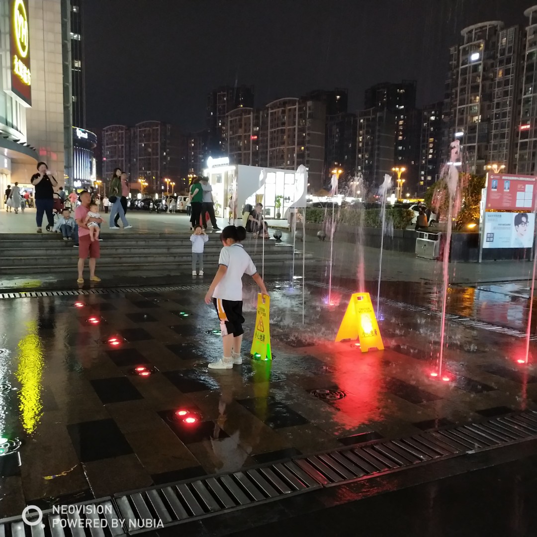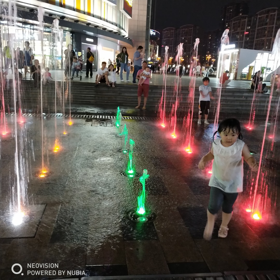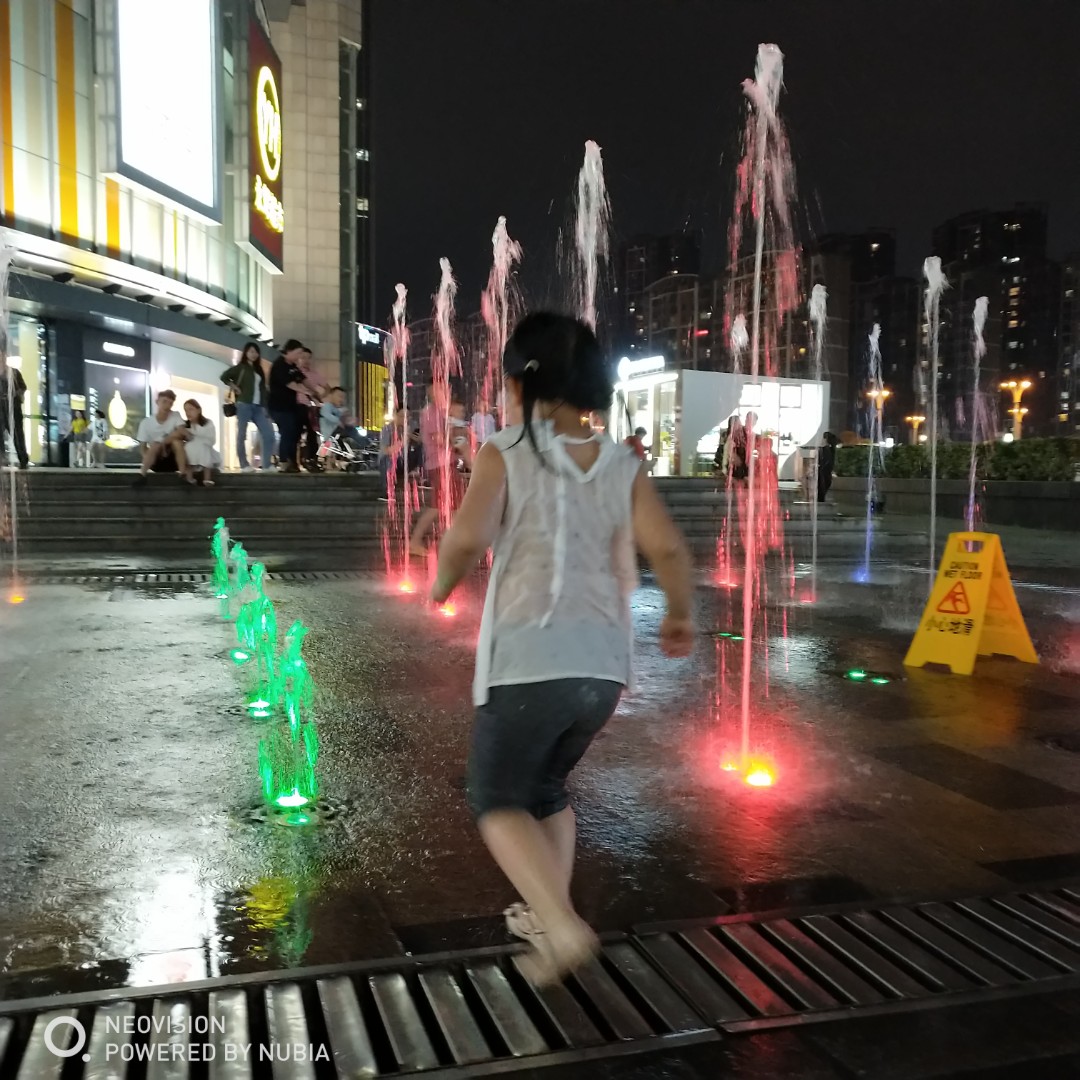 看见超市外面有块空地上有喷水,他特别开心。