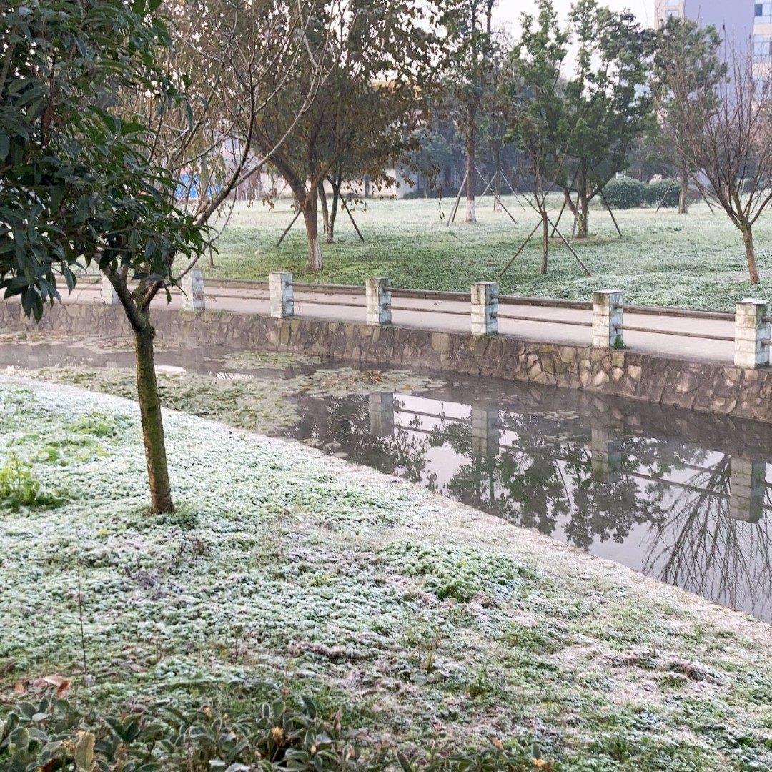 出了门发现草坪上都结了一层霜呢,原本绿色的草地都泛起白来,街上的人动作也僵硬了许多,估计也难耐住寒冷吧😂