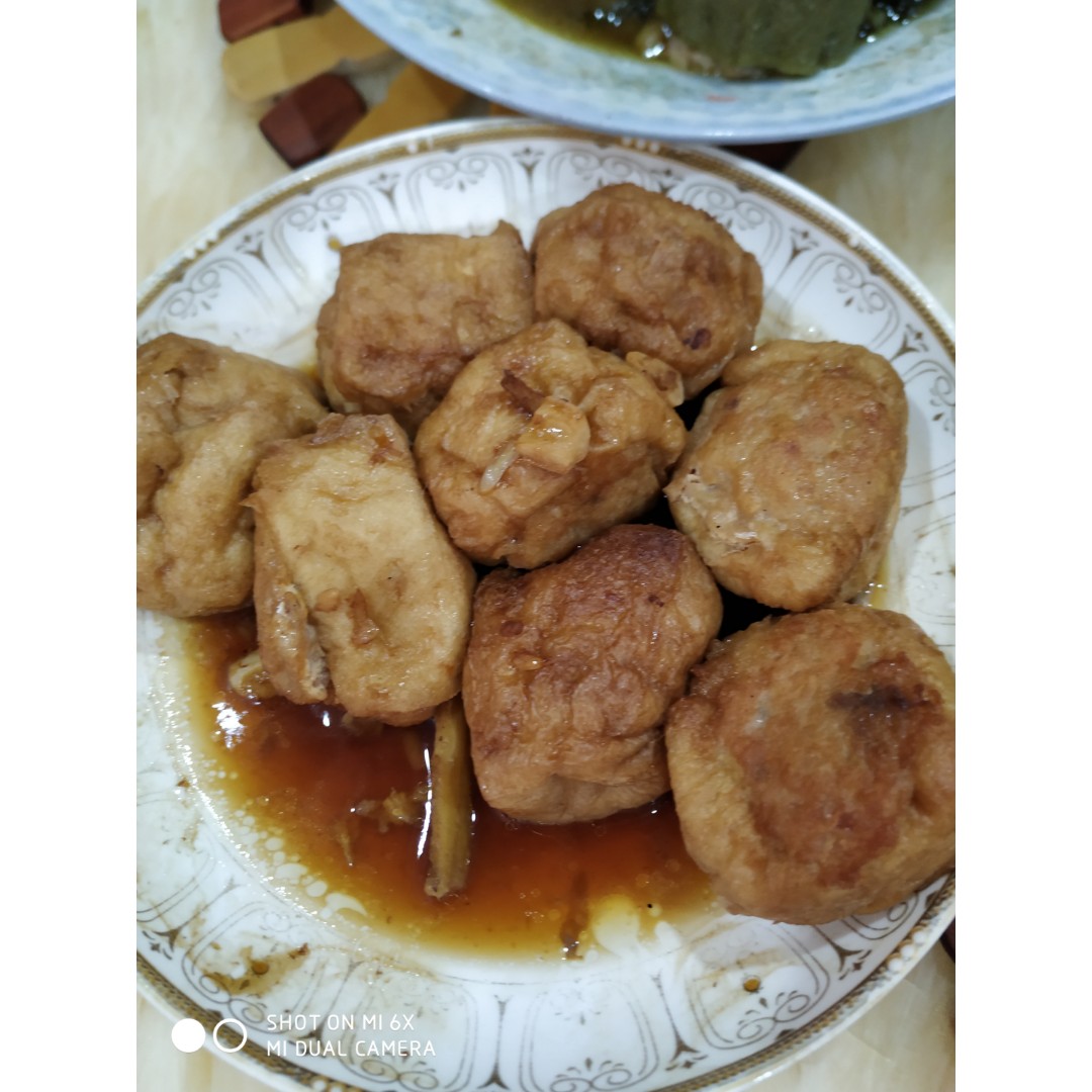 其实这道菜算是懒人菜了,只要把肉馅剁好,然后把买回来的油豆腐,挖口子把馅放进去就行了。当然还得把填好的油豆腐放入锅中,加入适量温开水,煮至水将干,然后加入适量蚝油和生抽就可以啦!